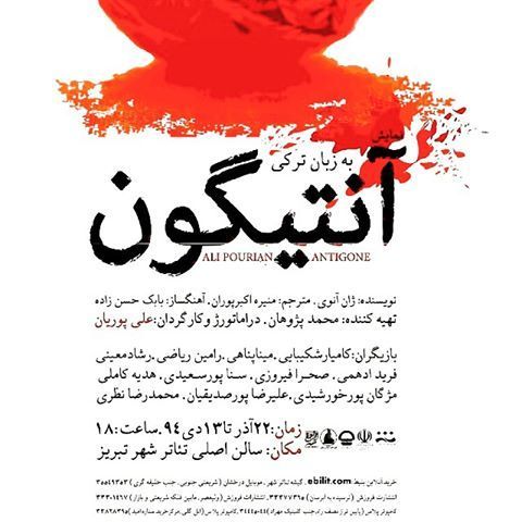 نمایش “آنتیگونه” به تهیهکنندگی محمد پژوهان و اهنگسازی بابک حسنزاده از ۲۲ اذرماه تا ۱۳ دی ماه هر روز از ساعت ۱۸ در سالن اصلی تئاتر شهر تبریز به روی صحنه میرود.