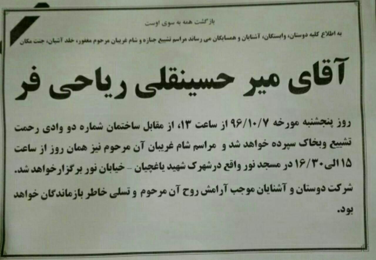 چوخ تاسفله آذربایجان شاعری میرحسینقلی ریاحیفر(سیّد) دی آیینین آلتینجی گونو حیاتا گؤز یومموش و ۶۳ یاشیندایکن ادبیات عالمینی ابدیلیک ترک ائتمیشدیر.