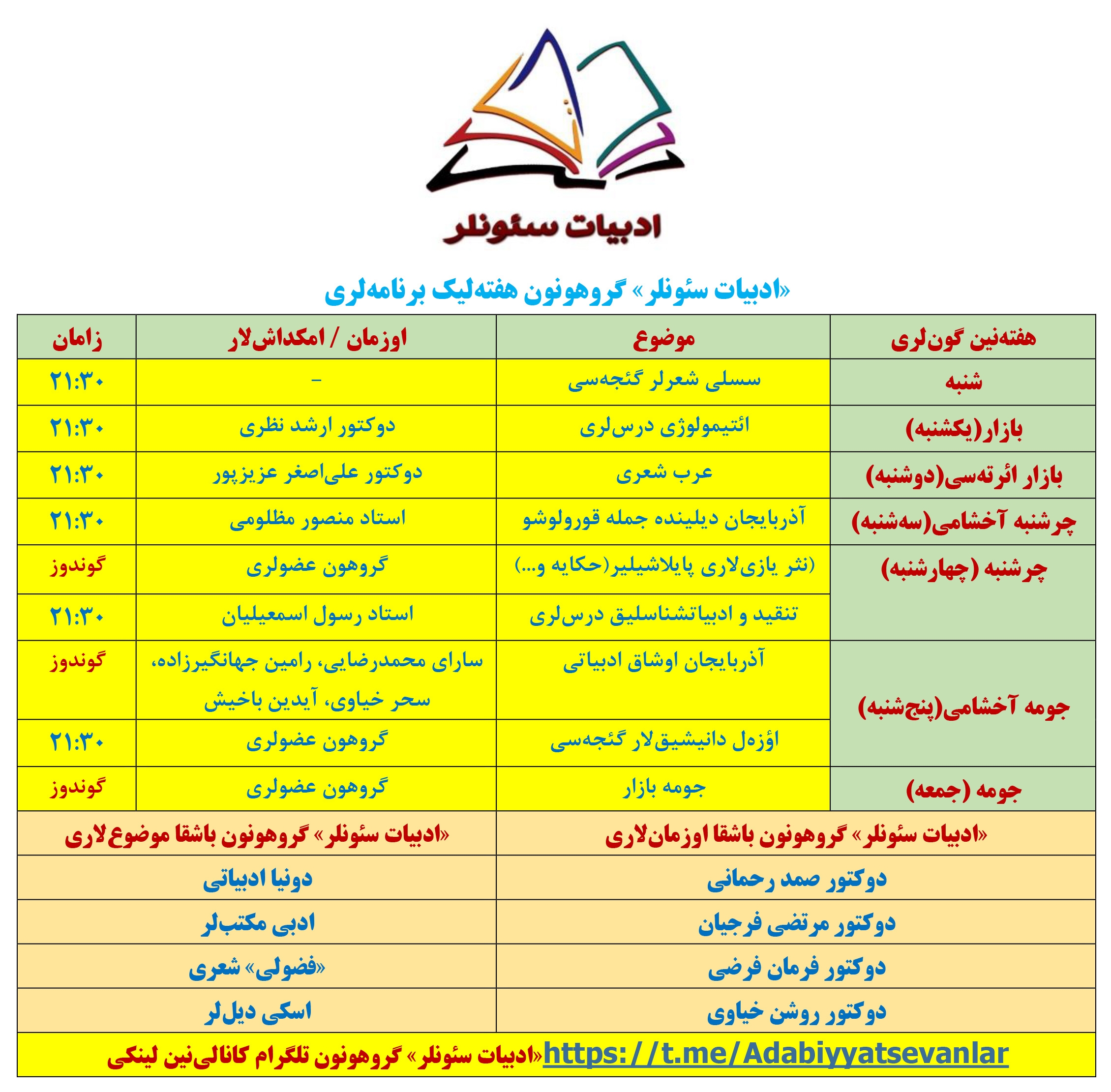 «ادبیات سئونلر» گروهونون هفتهلیک برنامهلری