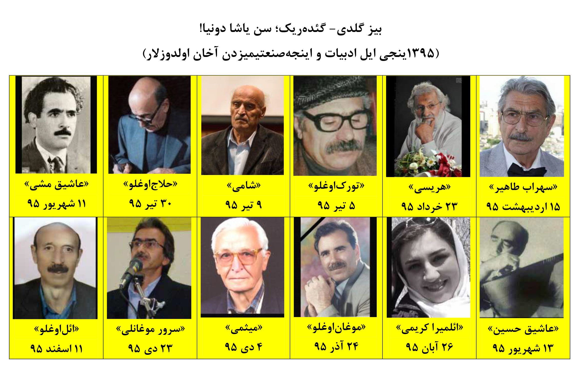 چوخ تاسفله آرخادا قویدوغوموز ۱۳۹۵ینجی ایلده ده ادبیات و مدنیت اولدوزلاریمیزدان ابدیلیک اولاراق سؤندولر. بو اینسانلار میللی مدنیتیمیزین ترقیسی و چیچکلنمهسی اوغروندا صرف ائتدیگی عؤمورلری اعتباریله، خالقیمیزین یادداشیندا همیشهلیک یاشایاجاقلار. اونودولماسینلار دئیه، بیر داهادا عزیز خاطیرهلرینه عشق اولسون دئییریک: