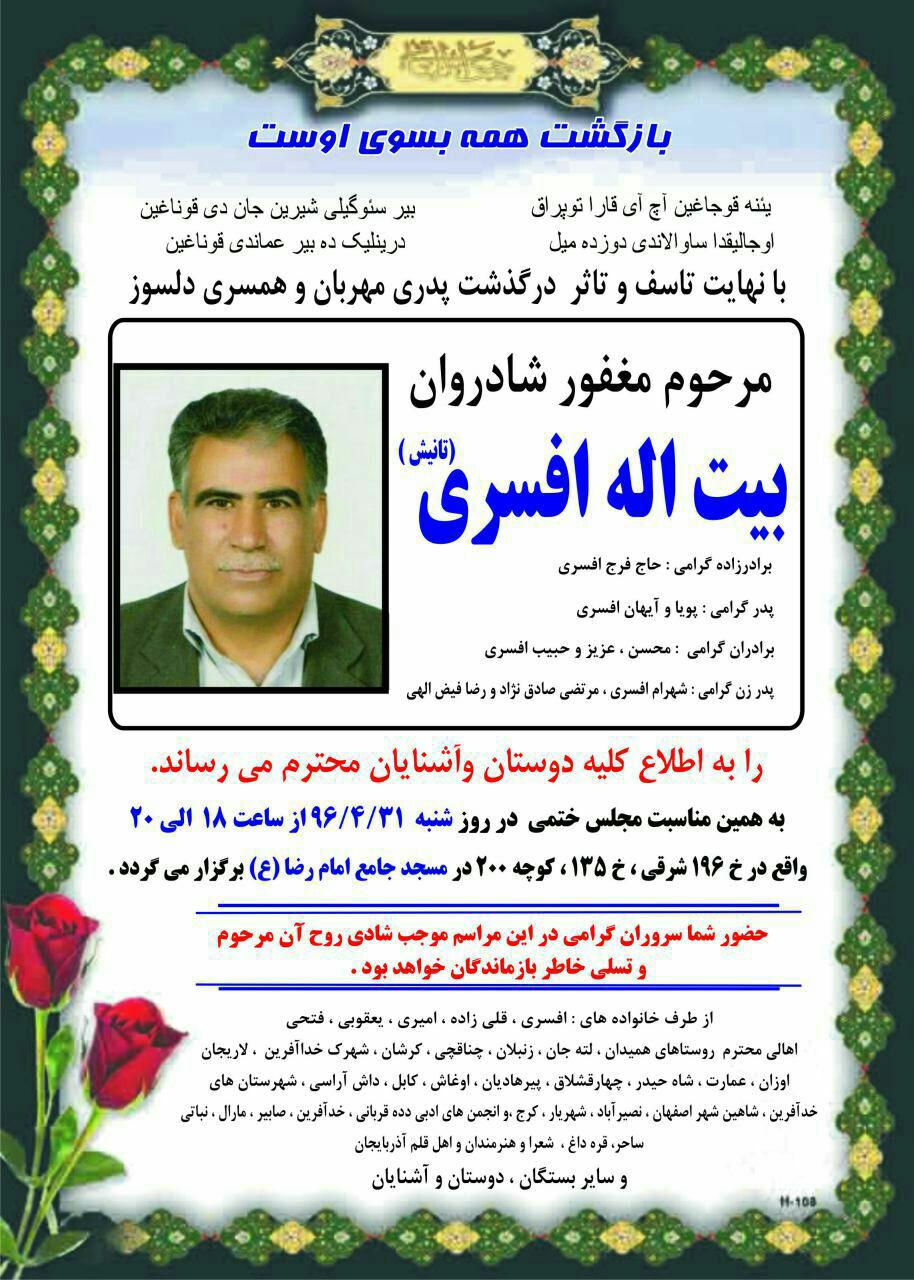 تانیش افسر (بیت‌الله افسری) قاراداغلی شاعر دوستوموز دونیاسینی باغیشلادی. تانری‌دان گؤزل شاعریمیزه باغیش، عائیله‌سی و دوستلارینا دؤزوم آرزولاییریق. مزاری نورلا دولسون. قاراداغ باشین ‌ساغ اولسون!
