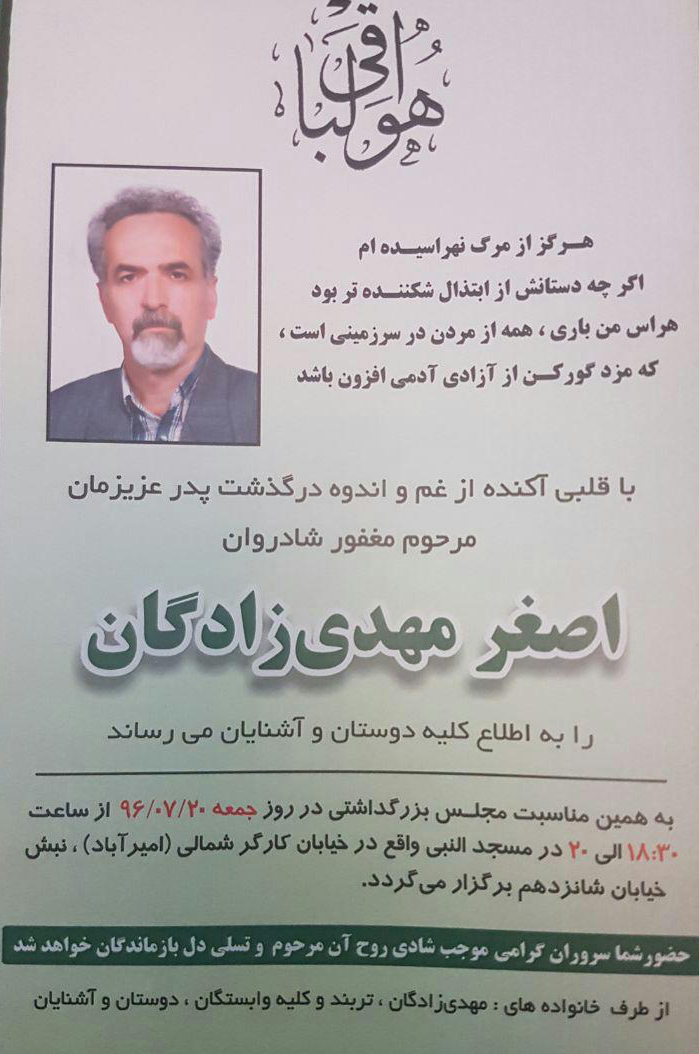 تشییع پیکر زندهیاد «اصغر مهدیزادگان» روز چهارشنبه ۹۶/۷/۱۹ ساعت ۱۰:۳۰صبح از مقابل غسالخانه بهشت زهرا انجام خواهد شد. همچنین مراسم یادبود ایشان روز جمعه ۹۶/۷/۲۱ از ساعت ۳۰/۱۸ تا ۲۰ در مسجد النبی واقع در خیابان کارگر شمالی(امیرآباد) نبش خیابان شانزدهم برگزار میگردد.