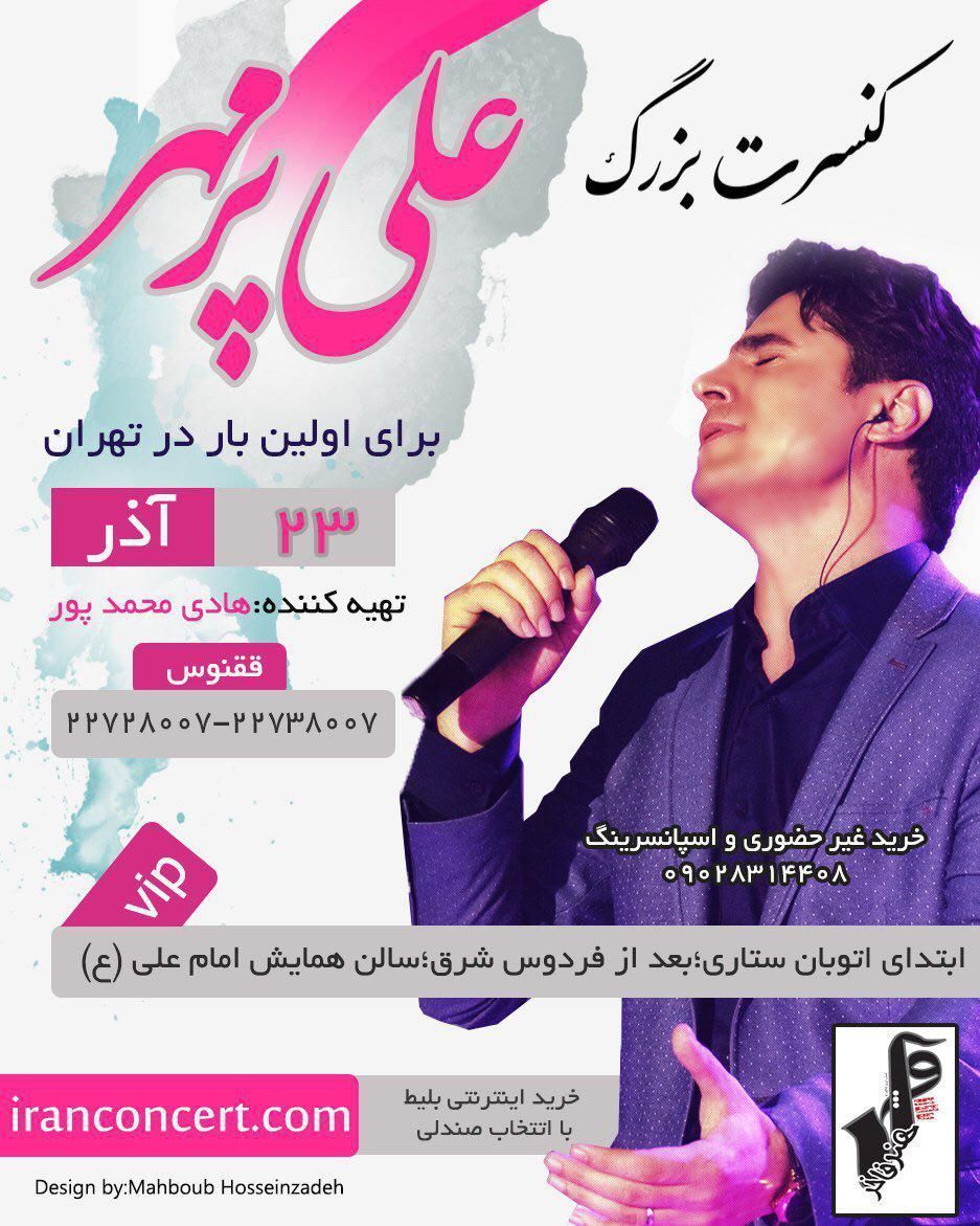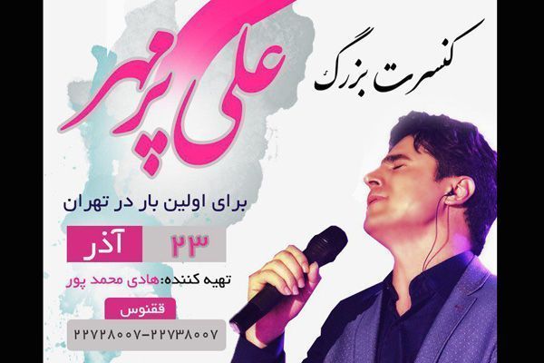 «علی پرمهر» خواننده جوان آذربایجانی برای اولین بار در تهران کنسرت بزرگ خود را برگزار میکند. این کنسرت در تاریخ ۲۳ آذرماه به تهیه کنندگی هادی محمدپور و در سالن همایش امام علی(ع) برگزار خواهد شد. فروش بلیط کنسرت از طریق اینترنت و توسط شرکت ققنوس به آدرس زیر صورت میگیرد: