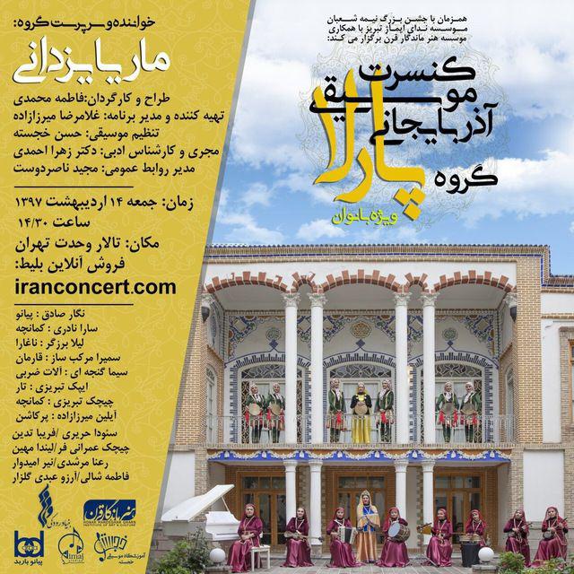 کنسرت آذربایجانی ویژه بانوان توسط گروه موسیقی «پارلا» در تالار وحدت تهران به اجرا درخواهد آمد. گروه موسیقی «پارلا» به رهبری و خوانندگی ماریا یزدانی متشکل از بانوان هنرمند آذربایجان است که روز جمعه ۱۴ اردیبهشت ماه از ساعت ۳۰/۱۴ قطعاتی از موسیقی شاد و مقامی آذربایجان را برای دوستداران موسیقی آذربایجانی اجرا خواهند کرد. طراح و کارگردان این کنسرت فاطمه محمدی و مجری و کارشناس ادبی آن دکتر زهرا احمدی میباشد. علاقمندان به حضور در این کنسرت میتوانند بلیط آن را از آدرس زیر تهیه نمایند: