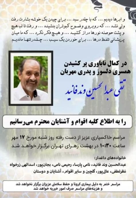 چوخ تاسفله عزیز دوستوموز «تقی عبدالحسین‌وند»ی ۶۶ یاشیندا کرونا ویروس سببیندن الدن وئردیک. بو آجی ایتگینی ایشیق سایتی امکداشلاری طرفیندن حؤرمتلی«عبدالحسین‌وند»، «نامی»، «فرشباف» و «زرخواه» عائله‌لرینه خصوصیله‌ده ادبیاتیمیزین حامیسی جناب بیوک‌آقا عبدالحسین‌وند(ب.نغمه‌لی) و سئویملی شاعریمیز اوستاد حبیب فرشباف معلمه، باش ساغلیغی وئریر و انسان سئورلیک اوغروندا چالیشقان دوستوموز «تقی عبدالحسین‌وند»ین خاطیره‌سینی عزیزله‌ییریک.