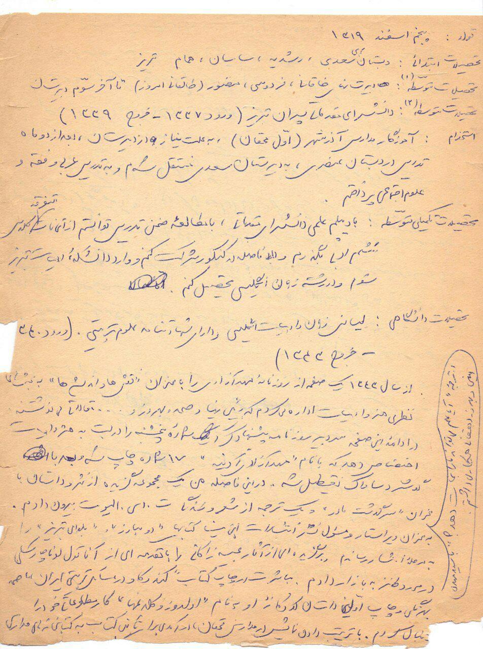 تحصیلات تکمیلی متوسّطه: با دیپلم علمی دانشسرای مقدماتی، با مطالعه ضمن تدریس توانستم از امتحانات متفرقه کلاس ششم ادبی بگذرم و بلافاصله در کنکور شرکت کنم و وارد دانشکده ادبیات تبریز شوم و در رشته زبان انگلیسی تحصیل کنم.