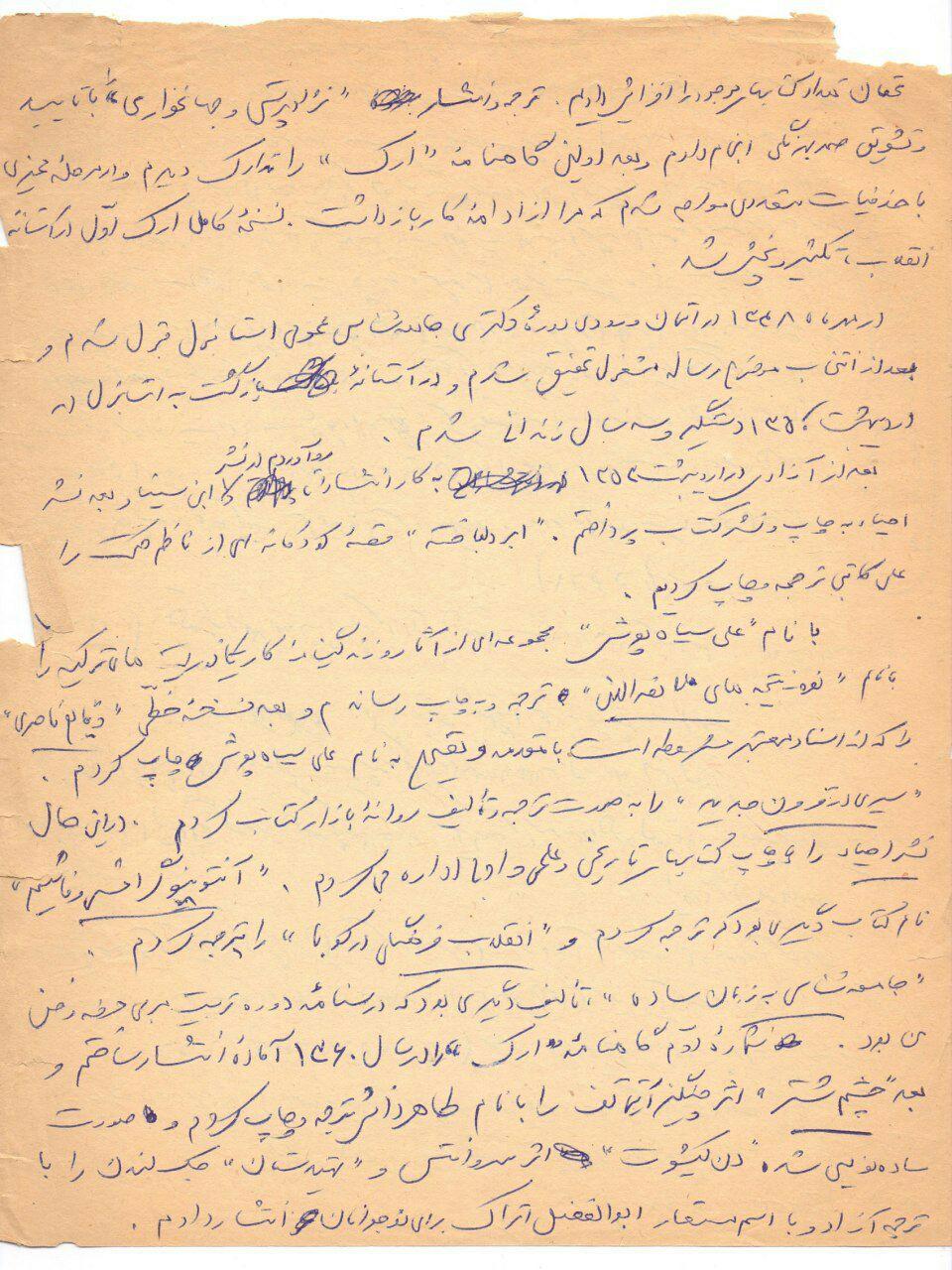 بعد از آزادی در اردیبهشت ۱۳۵۳ به کار انتشارات رو آوردم و در نشر ابن سینا و بعد نشر احیاء به چاپ و نشر کتاب پرداختم. ” ابر دلباخته ” قصه کودکانه ای از ناظم حکمت را با علی کاتبی ترجمه و چاپ کردیم. با نام ” علی سیاه پوش ” مجموعه ای از آثار و زندگینامه کاریکاتوریست های ترکیه را با نام ” نوه نتیجه های ملانصرالدین ” ترجمه و به چاپ رساندم و بعد نسخه خطی ” وقایع ناصری ” را که از اسناد معتبر مشروطه است با مقدمه و تصحیح به نام علی سیاه پوش چاپ کردم. ” سیری در قرون جدید ” را به صورت ترجمه و تألیف روانه بازار کتاب کردم. در این حال نشر احیاء را با چاپ کتابهای تاریخی و علمی و ادبی اداره می کردم. ” آنتونیو گرامشی و فاشیسم ” نام کتاب دیگری بود که ترجمه کردم و ” انقلاب فرهنگی در کوبا ” را ترجمه کردم.